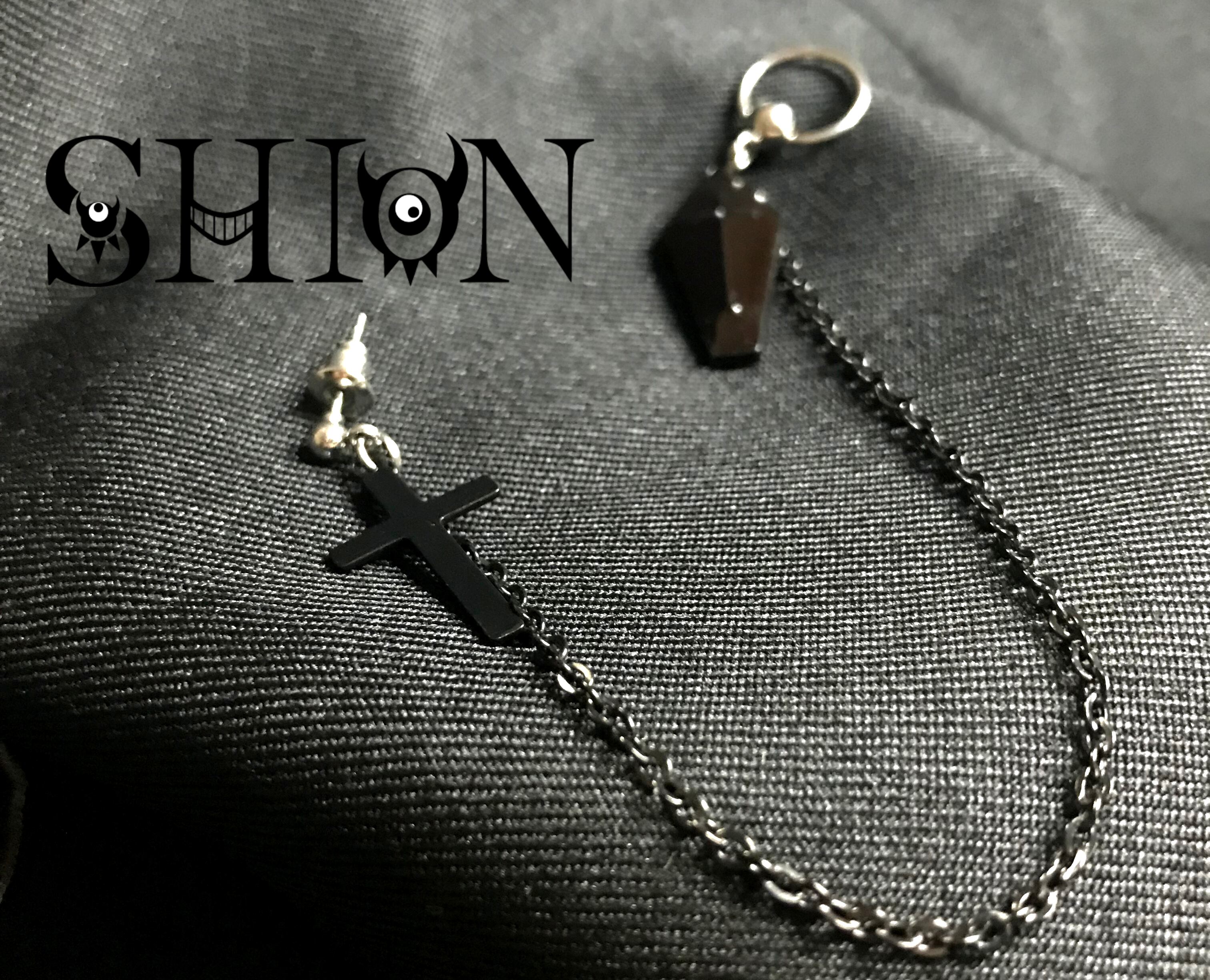 軟骨/ヘリックスとロブを繋ぐ黒い棺と十字架のサブカルピアスです!!